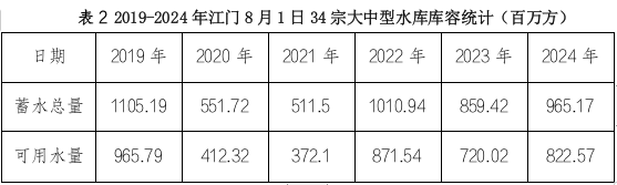 (三)水情:7月份月平均流量12600m3/s,较常年同期少9%。8月1日,34宗大中型水库蓄水总量965.17百万方,较常年同期多7%,蓄水总量占总正常库容比例为74%,可用水量822.57百万方,占总兴利库容比例为71%;21宗供水水库蓄水总量701.48百万方,较常年同期多9%,可用水量579.94百万方,占兴利库容比例74%。
