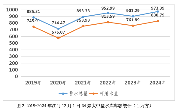 表2 2019-2024年江门12月1日34宗大中型水库库容统计(百万方)