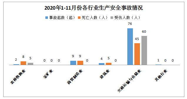 1-11月,全市共发生生产安全事故92起,其中农林牧渔业2起、商贸制造业9起,建筑业4起,交通运输和仓储业76起,其他行业1起。