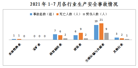 1-7月,全市共发生生产安全事故36起,其中农林牧渔业1起、占3%;商贸制造业7起、占19%;建筑业6起、占17%;交通运输和仓储业19起、占53%;其他行业3起、占8%。