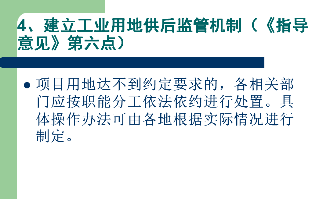 (一)建立部门共同监管机制。各地要进一步建立完善土地管理共同责任机制。对需享受政策的市场主体,投资或相关行业主管部门应向国土资源主管部门提供项目符合条件证明文件,国土资源主管部门登记备案后执行。对于有关部门提出规划条件、建设标准、非生产设施占地比例、产业类型、投资强度、产出效率和节能、环保等作为土地使用条件的,应按照“谁提出、谁监管”的原则,在土地供应成交后,提出关联条件部门应当要求土地使用者提交项目用地产业发展承诺书,作为国土资源主管部门签订合同的前提条件和关联部门的监管依据。提出关联条件部门应对承诺书的履行情况进行监督,并适时通报国土资源主管部门。项目用地达不到约定要求的,各相关部门应按职能分工依法依约进行处置。对不符合享受政策的,要及时终止政策执行。