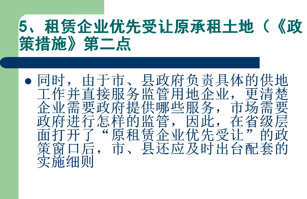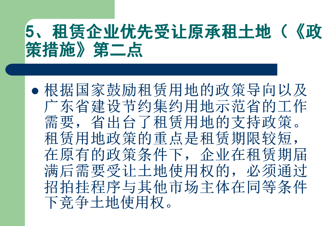 二、降低企业用地成本。各地市要划设工业用地控制线,年度建设用地供应计划要充分保障工业用地供给:“三旧”改造土地及省追加的新增城乡建设用地优先保障先进制造业需求;纳入省相关“十三五”规划的制造业项目享受省重点建设项目待遇。属于我省优先发展产业且用地集约的制造业项目,土地出让底价可按所在地土地等别对应工业用地最低价标准的70%执行。鼓励市、县实行工业用地弹性出让政策,对于采取弹性年期出让供应工业用地的,可按照出让年期与工业用地可出让最高年期的比值确定年期修正系数,对届满符合续期使用条件的,可采用协议出让方式续期。以先租后让方式供应的工业用地,租赁期满达到合同约定条件的,在同等条件下原租赁企业优先受让。省每年安排一定的用地指标奖励制造业发展较好的地市。