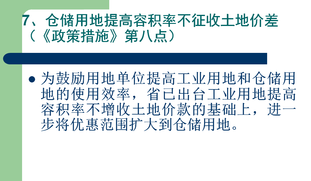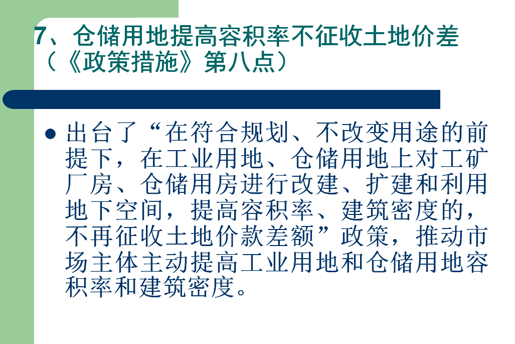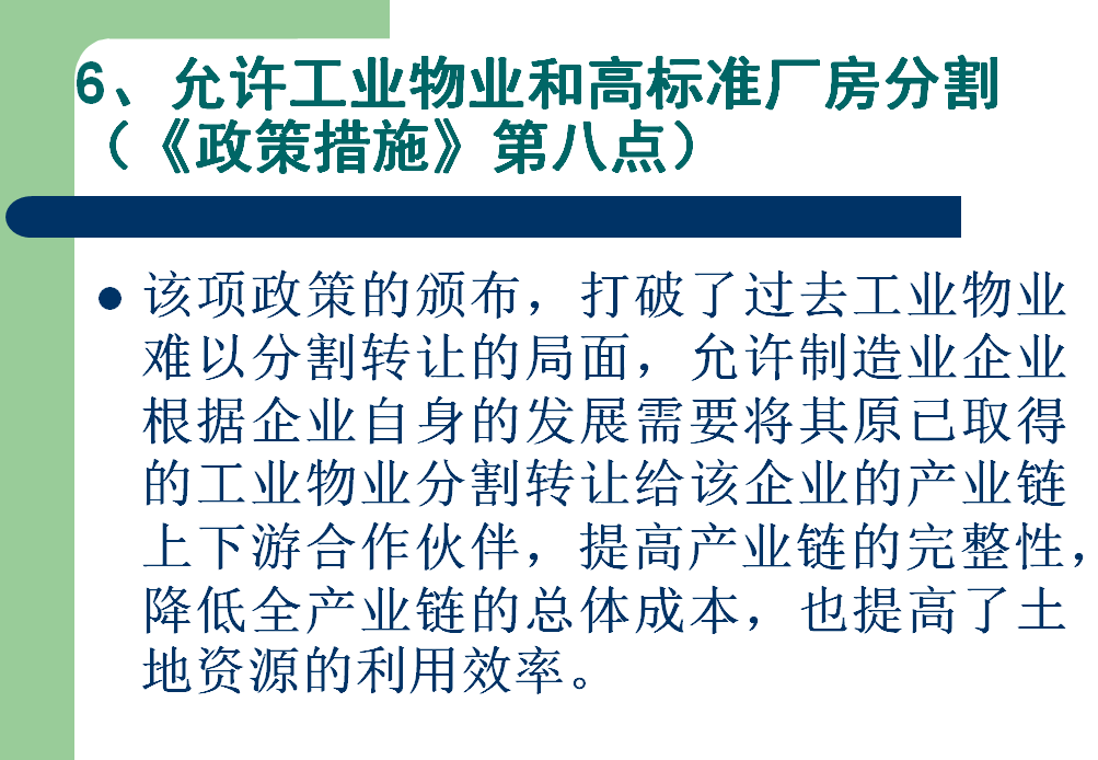 八、支持工业企业盘活土地资源提高利用率。允许制造业企业的工业物业产权按幢、层等固定界限为基本单元分割,用于引进相关产业链合作伙伴的产业项目。在符合规划、不改变用途的前提下,在工业用地、仓储用地上对工矿厂房、仓储用房进行改建、扩建和利用地下空间,提高容积率、建筑密度的,不再征收土地价款差额。支持和鼓励各地建设高标准厂房,高标准厂房可按幢、层等固定界限为基本单元分割登记和转让。支持试点城市解决重点制造业企业用地历史遗留问题,加快完善相关用地手续,所需用地指标在试点城市土地利用年度计划指标中优先安排,所在地不动产登记机构要开辟绿色通道,加快办理不动产登记。