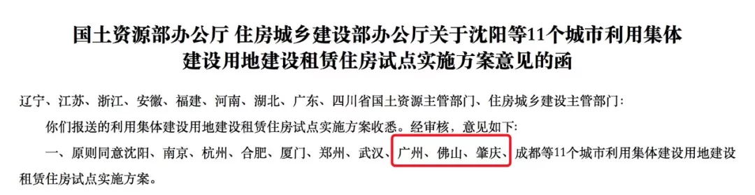 广州、佛山、肇庆 为住建部首批住房租赁试点城市,国土部和住建部利用集体建设用地建设租赁住房试点。