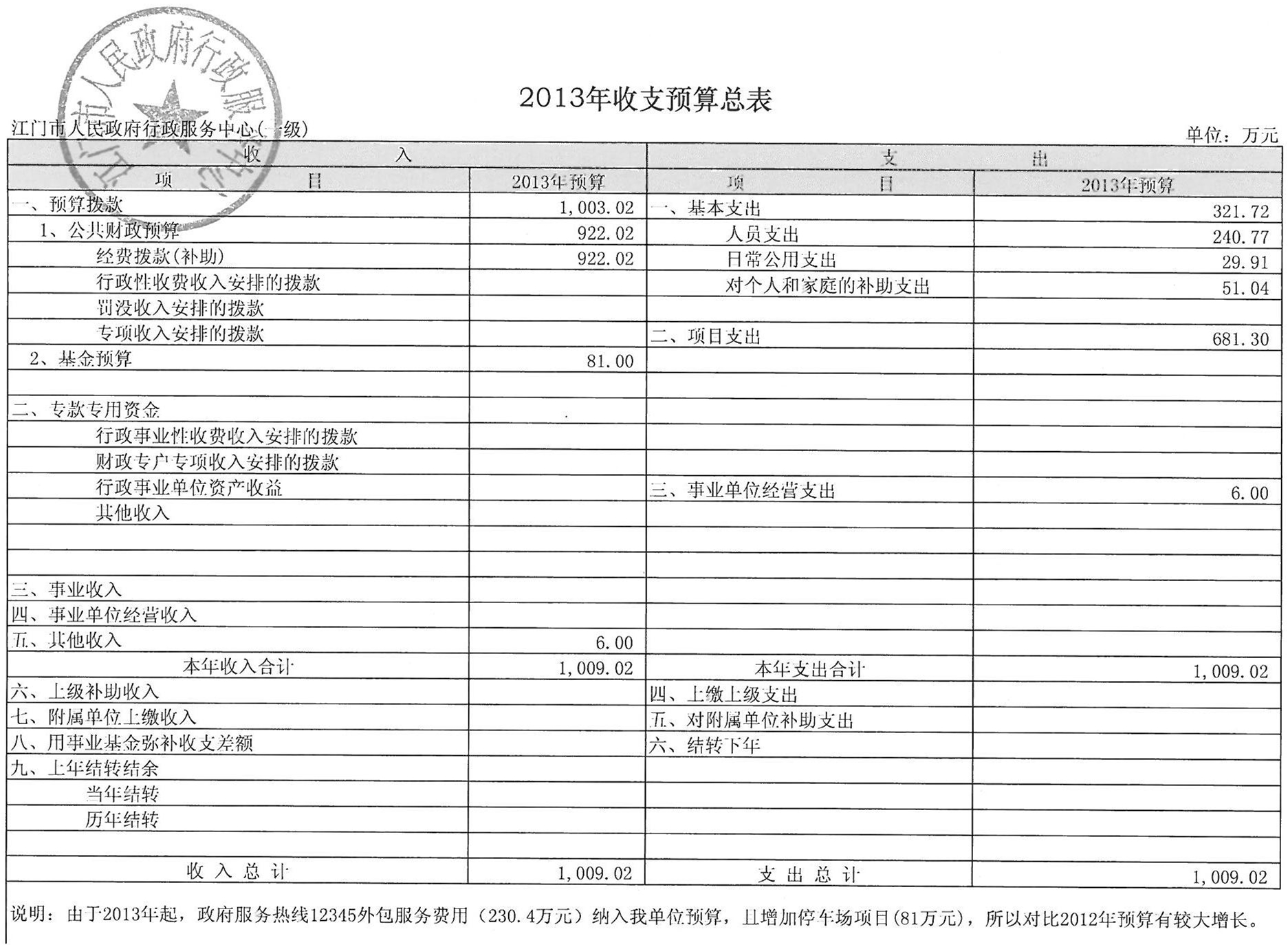 江门市行政服务中心2013年收支预算总表_部门预算_江门市太阳3娱乐和数据管理局