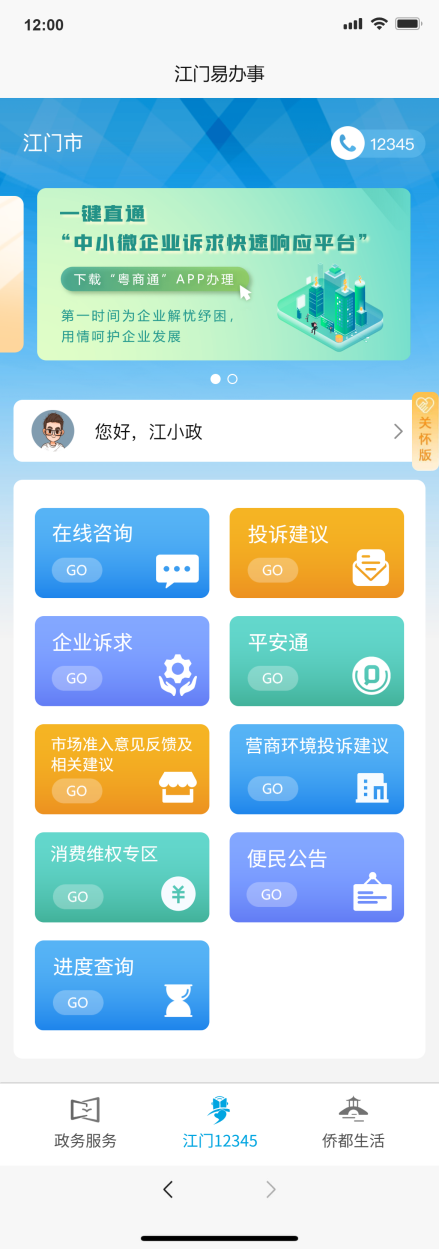 江门12345板块——移动享通过“江门12345”板块,提供多种沟通交流的互动渠道,您可以“在线咨询”“投诉建议”,也可一键直通“中小微企业诉求快速响应平台”,民声民意一键传递!如果您有市场准入、营商环境、消费维权等方面的诉求和建议,在这里,您想说的话我都认真听。