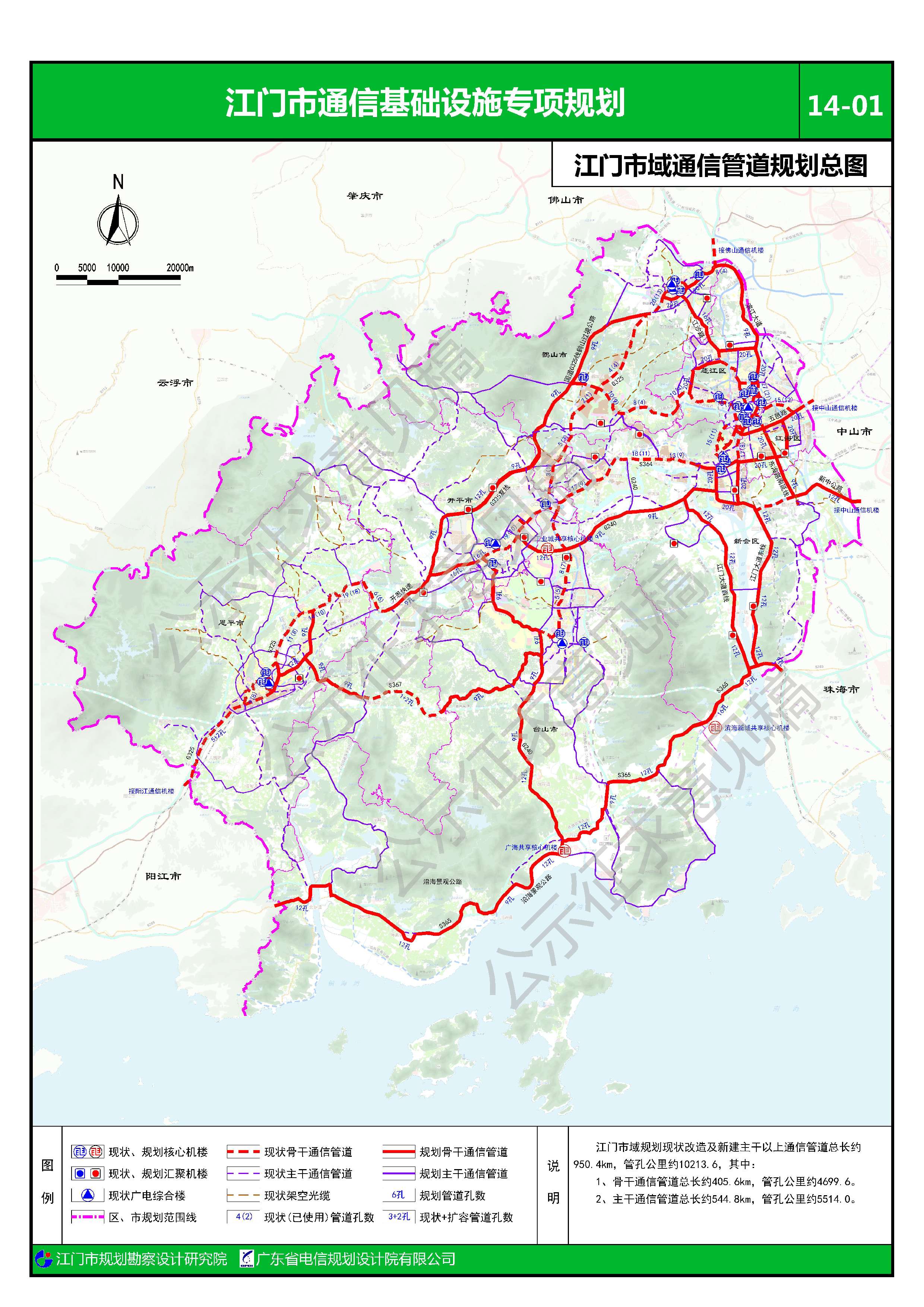 江门市域规划现状改造及新建主干以上通信管道总长950.4km,管孔公里10213.6,其中: