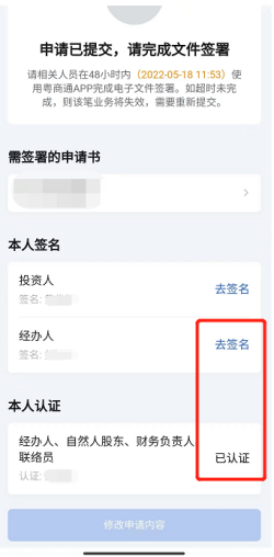 业务中指定职务/身份需要签名的成员,粤商通展示的为【去签名】,无需签名但担任职务/身份的成员,粤商通展示的为【去认证】(注:若同时担任需电子签名职务/身份人员,只需要完成签名,无需重复实名认证)