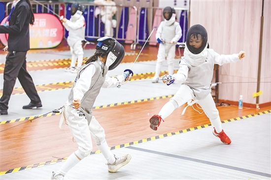 弓步、格挡、刺击……赛场上,选手们身着专业护具轮番上阵,在剑道上灵活走位、果断出击,留下了一幕幕精彩瞬间(见上图)。