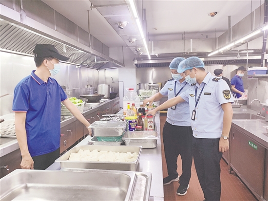 市场监管部门执法人员对十五运会接待酒店进行食品安全检查。