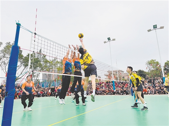 在台山市三合镇,球员腾空扣杀,攻防激烈,为观众呈现了一场精彩的排球赛事,让新春的喜庆氛围在运动的激情中愈发热烈。