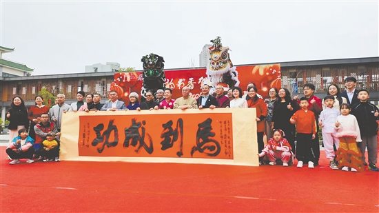 开幕式在市图书馆举行,现场处处洋溢着喜庆祥和的节日氛围:江门古琴研究会李春媚、黎素薇老师带来《梅花三弄》《醉渔唱晚》等经典曲目,清雅琴韵尽显中华传统文化之美;本地书法家黎大墨现场挥毫泼墨,以磅礴榜书为市民游客送上“马到成功”的新春祝福;鹤山古劳咏春拳劳炽文老师携弟子登台献艺,一招一式沉稳有力,展现侨乡武术的深厚底蕴;醒狮团队登场献瑞,金狮起舞、鼓乐齐鸣,将开幕式气氛推向高潮。此外,以“读经典 阅美食 学非遗”为主题的非遗课堂同步开讲,多位非遗项目代表性传承人轮番上场讲解,带领市民游客感受非遗魅力以及背后的传承故事。