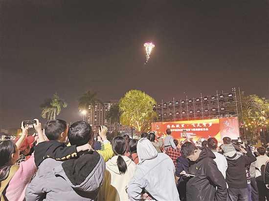 当晚7时30分,锦江公园亲水平台华灯璀璨,飞碟从江面腾空而起,拉开表演序幕。充满科幻感的飞碟上先后显示出“我爱恩平”“来恩平 我‘氧’你”等字样,并以光柱、烟火点亮夜空,光影随着本地乐队在舞台唱响的贺岁金曲与侨乡风情音乐律动起舞,现场年味与欢乐氛围拉满。最后,碟影归航,激光铺满江面,以富有科幻色彩的谢幕为新春再添亮色。
