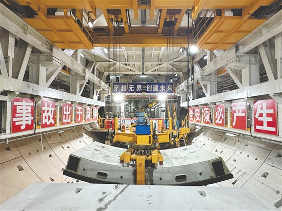 珠肇高铁江门至珠三角枢纽机场段计划年内建成。图为珠肇高铁圭峰山隧道进行管片吊装作业,该隧道已于日前全线贯通。