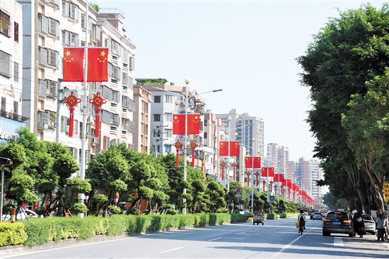 放眼望去,恩平中心城区一抹抹“中国红”鲜艳夺目,沿着道路不断延伸,形成了一道庄严亮丽的风景线。