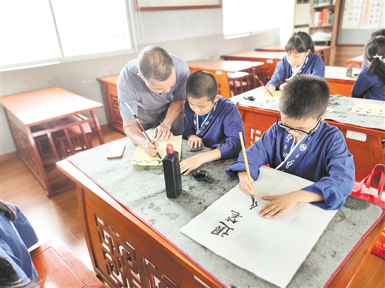 恩平“侨童学堂”的书法老师指导侨童们书写。