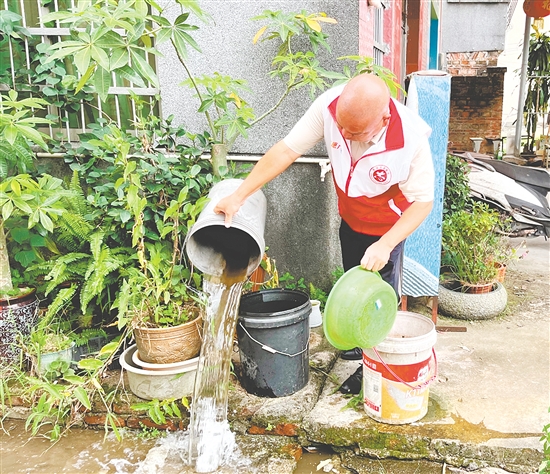 党员志愿者逐户排查积水容器等蚊虫孳生地。