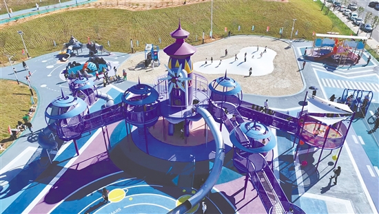 无动力“飞行梦工厂儿童乐园”占地面积3万平方米,以航天飞行为主题,分为飞行学院、飞行营地、寰宇巡航站和云端塔台四大区域,设置14类游乐设施,配套人造弹性地面、草地及游客服务中心,面向3-12岁儿童提供攀岩、滑行、跳跃等多种游玩形式。