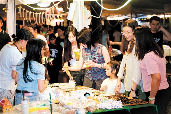 茶饮小吃、潮玩手作、首饰精品……活动现场设置了50多个创意小铺摊位,各类商品琳琅满目,来往的市民纷纷驻足,挑选自己喜欢的商品。本次市集的许多摊位由大学生创新创业大赛的优秀项目团队负责,大学生们通过摊位陈设、营销方式等展现了他们的才华与创意。此外,来自大湾区各城市风格各异的9支青年乐队带来一场音乐狂欢派对,将活动推向高潮。