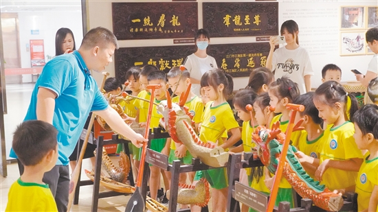 “一二三,扯离佢!小朋友们,你们知道吗?礼乐龙舟有300年的历史,是省级非物质文化遗产。”7月30日,在礼乐街道党群服务中心,江门市级赛龙舟传承人区锦豪娓娓道来。这是7月以来,区锦豪第三次在这里讲解礼乐龙舟文化。