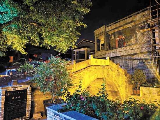 树是跨龙村的一大特色。村内有7棵近100年的大榕树,葱葱茏茏,沿着河岸生长。夜幕降临,“一河两岸”灯光亮起,老人们坐在榕树下乘凉,拉起家常,享受岁月的静谧。