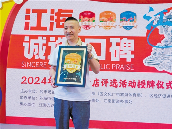 据介绍,今年8月以来,在区市场监管局牵头下,2024年度“江海好店”评选——“江海诚选·口碑”主题活动在全区火热开展。活动期间,各街道、各部门、各行业积极推进“江海好店”品牌建设,共同推选出一批消费者认可、安全有保障、信誉度高的单位,最终评选出首批“传承老店”“金牌商家”“优选商家”共计96户。活动当天,主办方分别为获得“江海好店”荣誉的商家授牌。