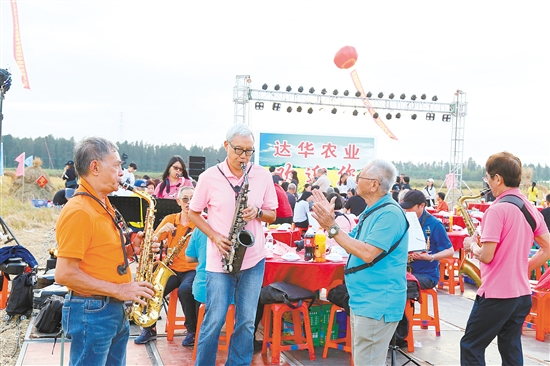 表演人员在稻田里吹响萨克斯风,与澳门礼乐乡亲齐庆丰收。