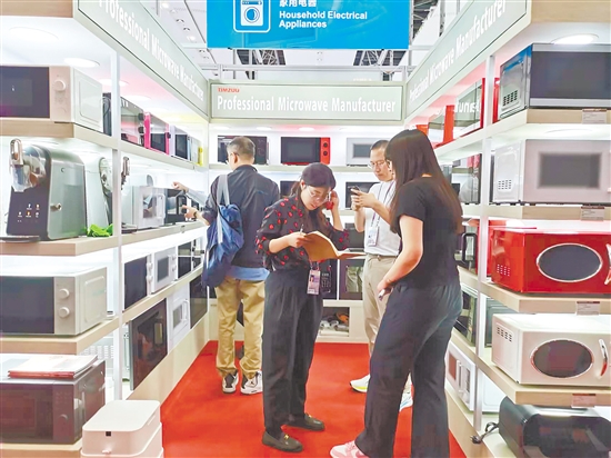 天倬智能家居生产的微波炉等家电产品吸引客商咨询。凌雪敏 摄