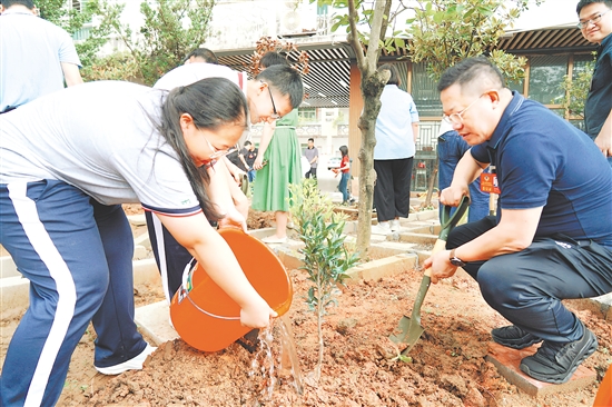 随后,学生们同政协委员们一同种植了新会柑、麦冬苗等药用植物,体验劳动乐趣与文化传承的双重意义。本次种植的药用植物中,部分药材由区政协委员、江门市伯坛文学本草文化中心创办人王军东捐赠。王军东表示,作为中医药界别的政协委员,他看到学校主动搭建中医药文化传承平台,用心培养青少年对传统文化的认同感,深受触动。他希望这片中草药园能成为孩子们探索自然、理解生命的窗口,让中医药文化的种子在年轻一代人心中生根发芽。