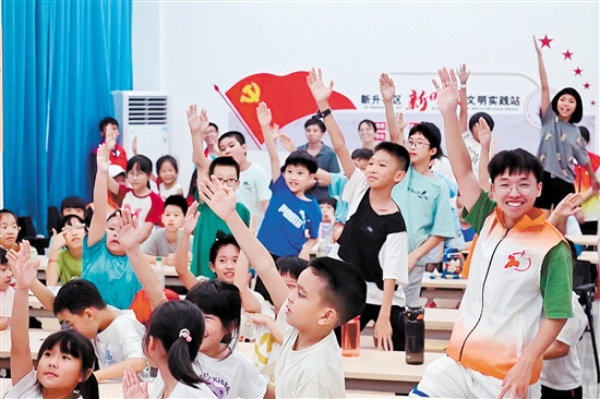 在沙坪街道新升社区,孩子们在“燃爆暑假 七彩夏日”暑假课堂上争相发言。