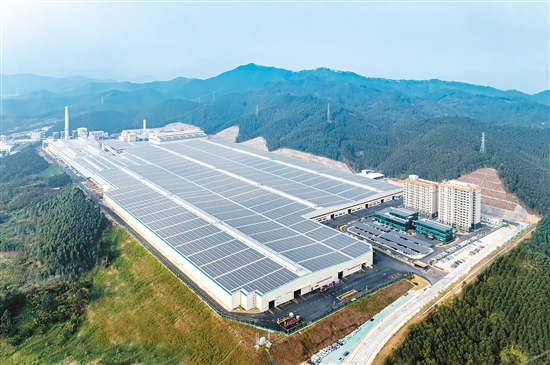 信义节能玻璃(江门)有限公司的厂房顶部大面积铺设光伏发电系统,以实现节能减排的目标。
