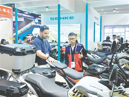 展会现场,鹤山企业生产的摩托车吸引海外采购商驻足。