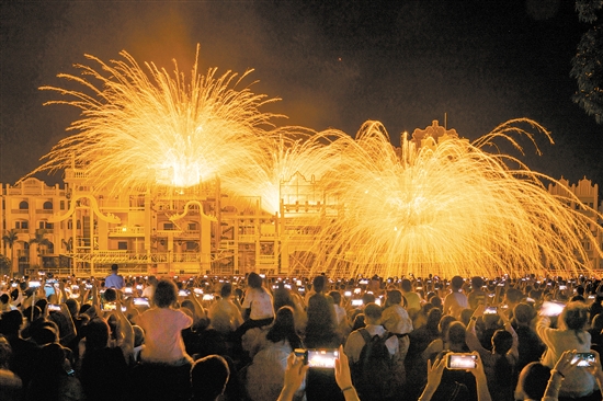 “火秀”表演也是不少游客期待的项目。赤坎华侨古镇为了回应游客的热情,本来只计划在晚上10时进行的表演,专门又在晚上7时进行了加演。火壶、铁花、火龙以及烟火接连上演,庆祝新中国75周年华诞。游客们纷纷拿出手机拍摄,定格这难忘的一刻。