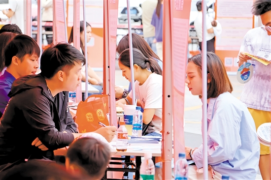 “您曾经的工作经验是怎样的?”“这个岗位薪酬如何?”“企业提供岗前培训吗?”企业招聘人员与求职者在活动现场交流信息、匹配需求。