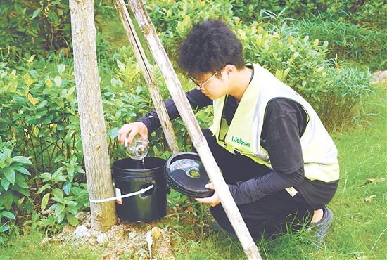 工作人员在益蚊扩散站定期投放沃尔巴克菌雄蚊蛹。