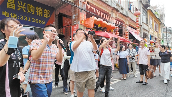 来自全国各地的专家学者、青年影像创作者、媒体代表深入蓬江各地采风。图为活动嘉宾在长堤历史文化街区沉浸式感受城市文化气息。 刘淑君 摄