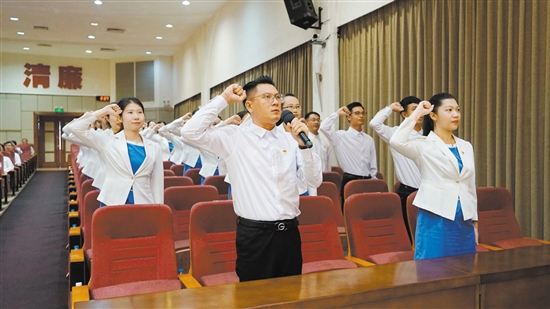 “我志愿成为一名光荣的人民教师,忠诚党的教育事业……”新入职教师代表铿锵有力的宣誓拉开了会议的序幕。