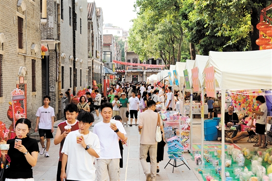 整个国庆假期,长堤历史文化街区活动纷呈。10月1日早上,75头醒狮和彩带龙齐聚长堤历史文化街区,共贺新中国75周年华诞。随后,“翰墨谱华章”庆祝中华人民共和国成立75周年书法长卷挥毫活动、“墟街有戏”系列活动、“活力长堤·邑起创作”大学生文创产品创意设计大赛作品展、“画上墟街”青年绘画写生作品展、“乐动长堤·舞力绽放”现场表演、“镜头下的国庆、即影即留美好”打卡活动以及特色市集等多项活动接连举行,为市民游客带来了视听味的多重惊喜。“走读侨文化 趣游长堤历史文化街区”打卡活动也在当天启动,市民游客可以通过手机小程序,跟着电子地图完成打卡任务,在趣游中探寻侨文化的根脉、领略侨文化的独特魅力。国庆假期期间,长堤历史文化街区最高单日人流量近5万人次。
