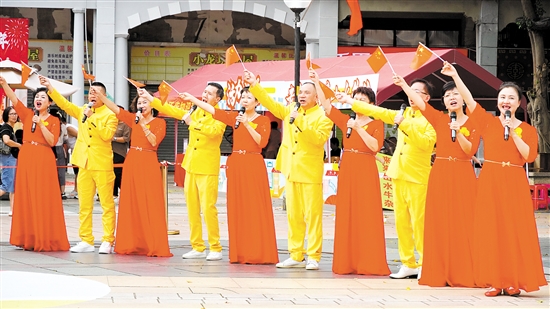 “我们祝福你的生日,我的中国……”10月1日下午,“墟街有戏”快闪活动——庆国庆爱国歌曲演唱专场在长堤青年广场准时开唱,江门和美合唱团的团员们身着统一的服装,用真挚的情感和动人的歌声,向祖国母亲献上深情的祝福,吸引众多市民游客加入快闪活动。