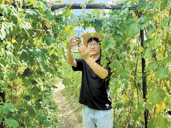 上巷村选调生鲁森走进田地观察凉瓜生长情况。