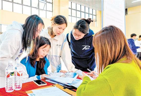 蓬江企业代表耐心解答广西高校学生对岗位工作内容等方面的咨询。