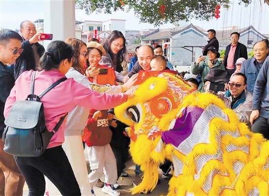 “咚咚隆咚呛,咚咚隆咚呛……”1月30日,在崖门镇京梅村蔡李佛文化广场,一红一黄两头醒狮伴随着鼓声起舞,市民游客纷纷上前与醒狮互动,摸狮头、碰狮尾,为新的一年谋个好彩头。
