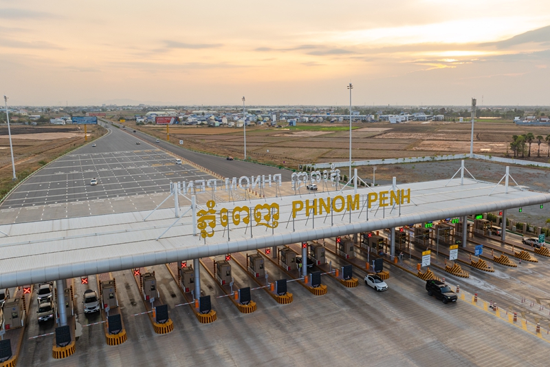 这是2025年3月17日在柬埔寨金边拍摄的金港高速金边收费站(无人机照片)。新华社发(张金加 摄)