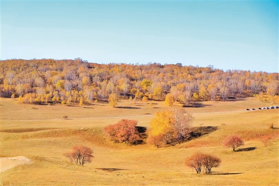 乌兰布统的秋天,像是打翻了的调色盘,漫山遍野的五彩桦树林,绵延起伏数百里,犹如铺上了一张五彩斑斓的地毯。何雯意摄