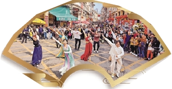 当天上午,长堤历史文化街区人潮涌动,游人如织。10名来自戴爱莲文化艺术发展有限公司的舞者,身穿古典舞、民间舞等不同服装来到了这里。这些充满激情活力的舞者在人群中表演了一场热闹又喜庆的舞蹈,以传统文化和现代潮流的碰撞给市民游客带来全新的观感体验,赢得在场观众阵阵喝彩声,让活动现场成为一片欢乐的海洋。