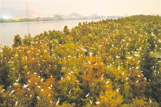 冬日侨乡,位于新会会城街道天马村“小鸟天堂”附近的南坦岛,每到黄昏时分,江边的水杉林就会出现“万鸟归林”的壮观景象。
