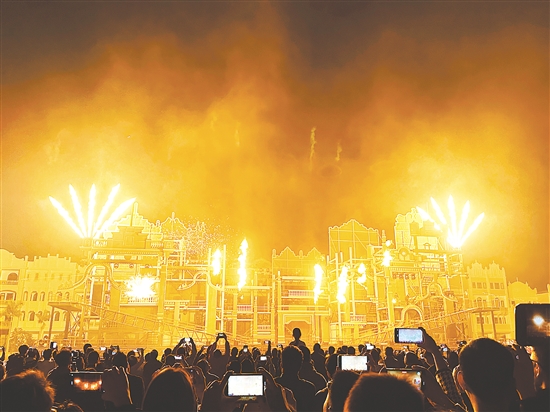 赤坎华侨古镇精彩的火秀表演吸引游客。