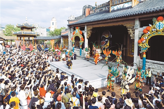 “五一”假期,赤坎华侨古镇推出“白+黑”全景文化体验:日间的高跷木偶巡游、杂技秀重现传统技艺;夜幕降临后,《火秀》《归途》等声光电升级剧目震撼上演。除此之外,特别编排的《南楼!南楼!》《一代宗师》等实景演艺,更是将历史故事融入3公里长的骑楼长廊,让历史建筑成为文化传播的新载体。