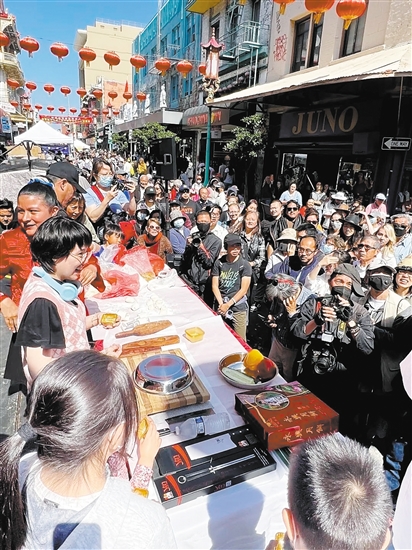 美国旧金山华埠中秋街会上进行月饼制作示范,传播中国优秀传统文化。图片由江门市侨联、江门市侨媒中心收集提供