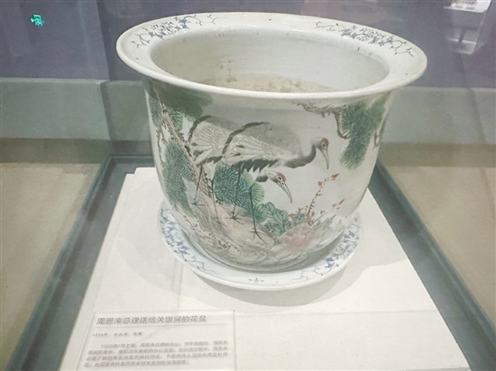 “我的曾祖父1894年11月出生于开平县塘口以敬三板步村的一个华侨家庭,是侨乡开平最早受到周恩来总理接见的归侨之一。他毕生致力于华侨社团工作,是万隆广肇会馆创办人、领导人之一。他曾出任万隆市各界侨团总机构——中华总会副主席,为促进华侨团结、建设祖国作出很大的贡献……”关崇涧的曾孙关英华说,这虽然看似一个普通的花盆,但却是关崇涧生前的宝贝,是周总理与他友谊的见证。